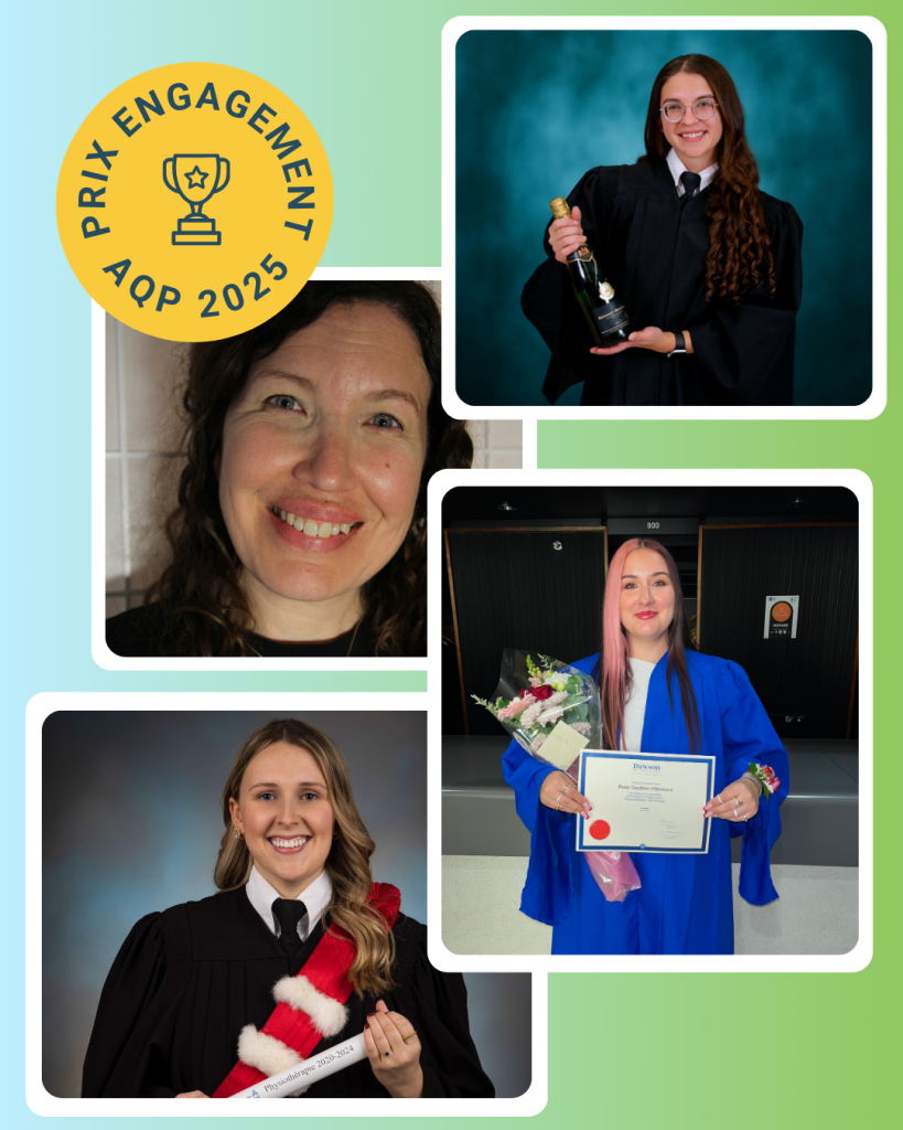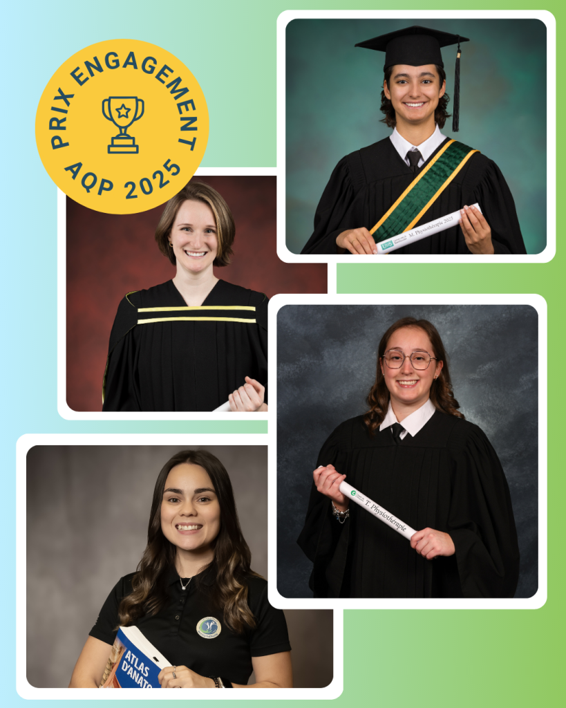 Le conseil d’administration de l’AQP est fier de présenter le Prix Engagement Étudiant AQP en lien avec la raison d’être de l’Association. Cette distinction est décernée à un étudiant par établissement d’enseignement qui aura su, par son engagement exemplaire, faire rayonner la physiothérapie et les professions de technologue en physiothérapie ou de physiothérapeute.