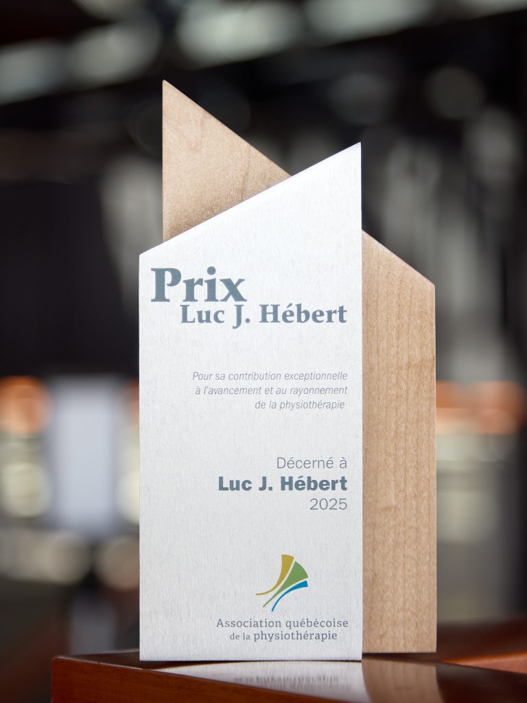 Ce prix a été dévoilé pour la première fois lors du 7ᵉ Sommet de la physiothérapie de l’AQP, tenu à Québec le 24 octobre dernier, et nous avons eu le privilège de remettre le tout premier trophée à celui dont il porte le nom : Luc J. Hébert, fondateur et président fondateur de l’AQP.