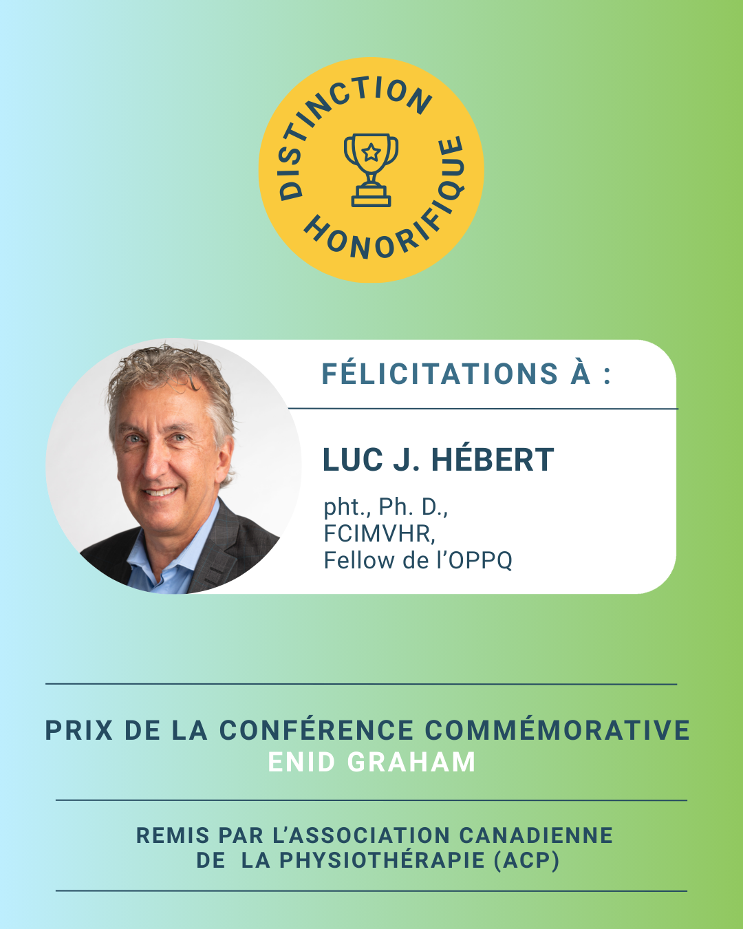 Par l’ampleur, la rigueur et l’impact durable de ses contributions, Luc J. Hébert incarne pleinement l’esprit et les valeurs du prix Enid Graham.