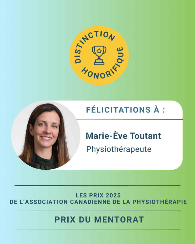 L’Association québécoise de la physiothérapie est fière d’annoncer que Marie-Ève Toutant, pht, collaboratrice engagée de l’AQP, est lauréate du Prix du mentorat de l’Association canadienne de physiothérapie (ACP) pour 2025.